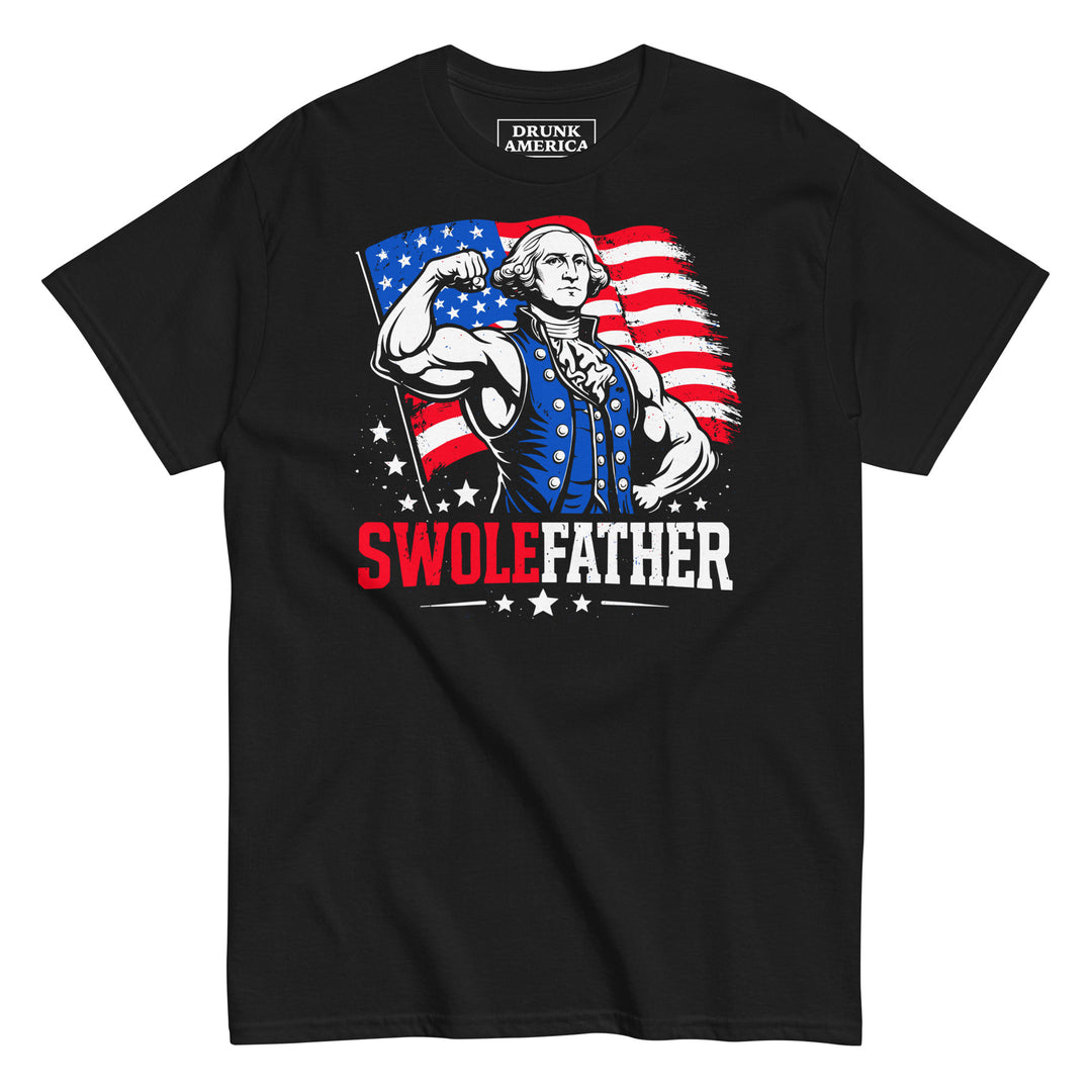 The Swole Father graphic t shirt turns George Washington into a full blown legend. Featuring a jacked founding father flexing in front of a distressed American flag, this design brings together strength, freedom, and unapologetic American pride.