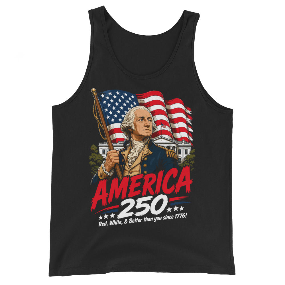 This tank top brings strong American pride with a bold historic design. Featuring George Washington holding the American flag with the White House behind him, the “America 250” graphic stands out.