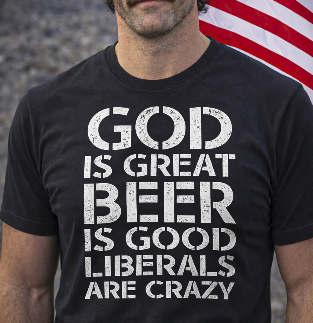 This conservative Christian political graphic t shirt features the bold stacked message “God Is Great Beer Is Good Liberals Are Crazy,” designed to blend faith, humor, and unapologetic political attitude into one clean statement. The typography driven design delivers high contrast readability and is centered on the front of the shirt, making it instantly recognizable and easy to read at a glance.