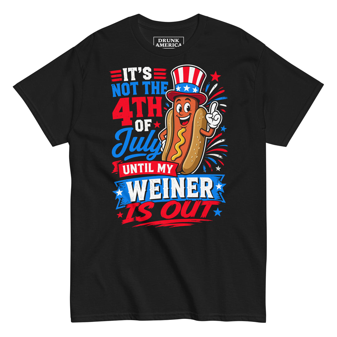 This funny 4th of July graphic t-shirt brings classic cookout humor front and center with a bold patriotic hot dog design and the phrase “It’s Not the 4th of July Until My Weiner Is Out.” Built for laughs, it’s the perfect mix of American pride and backyard barbecue energy.