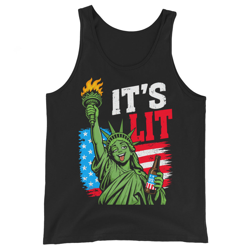 This bold patriotic tank top delivers a fun, party ready vibe with a unique design featuring the Statue of Liberty in a carefree moment paired with the phrase “It’s Lit.” Perfect for fans of funny 4th of July tank tops and American themed drinking apparel, this design mixes classic symbolism with high energy humor.