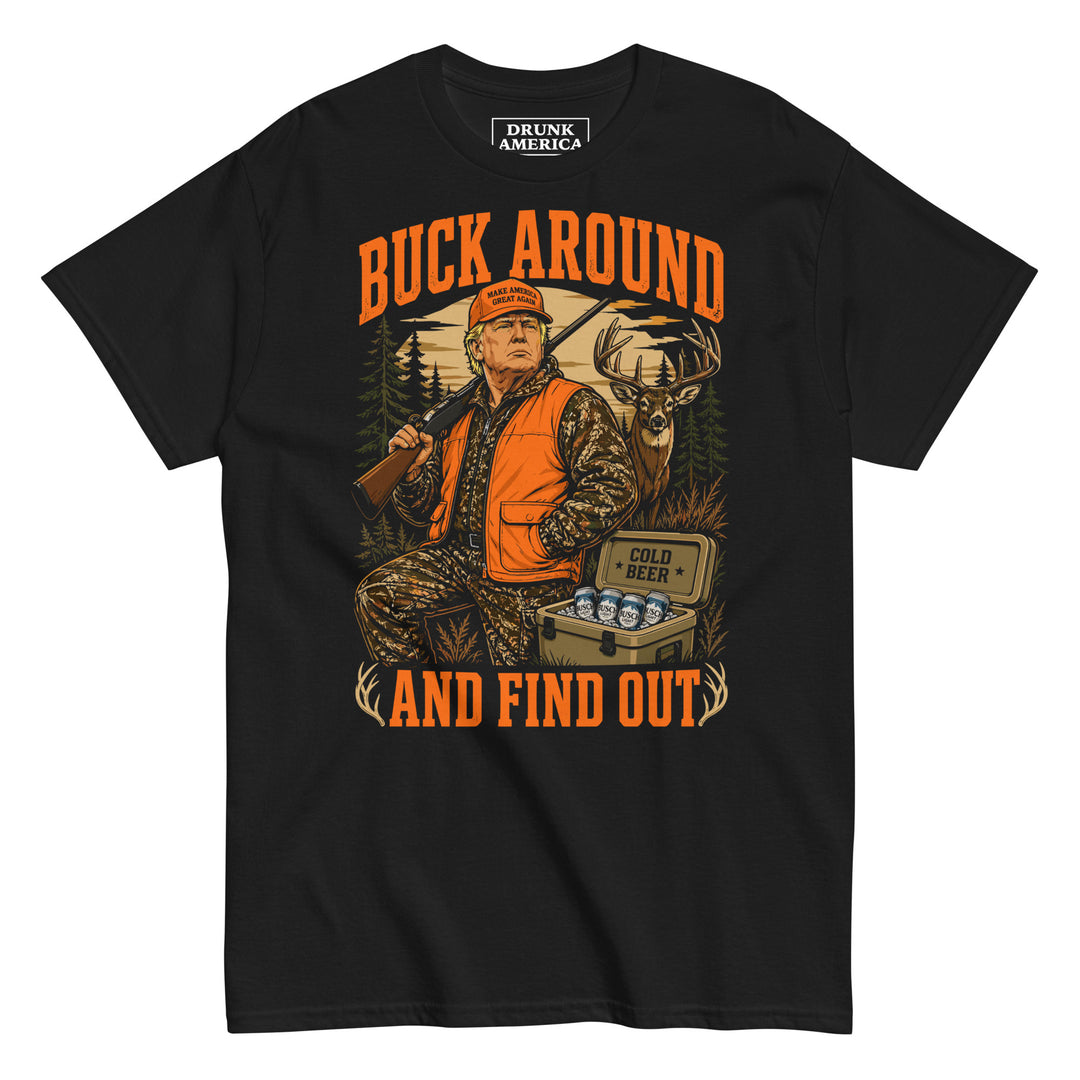 This graphic t shirt brings rugged outdoor humor with a bold hunting edge. Featuring Trump in full camo with a rifle, a buck in the background, and a cooler packed with cold beer, the “Buck Around And Find Out” design is built for hunters who mean business.