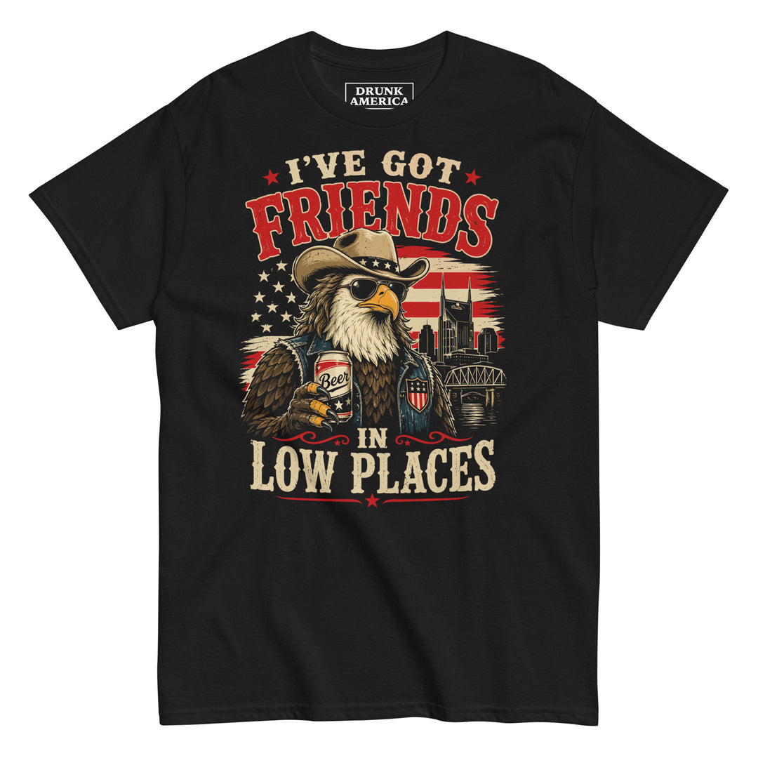 This graphic t shirt blends country music vibes with laid back patriotic style. Featuring a cool bald eagle in sunglasses and a cowboy hat holding a cold beer in front of an American flag and city skyline, the “I’ve Got Friends In Low Places” design brings southern attitude with a fun twist.